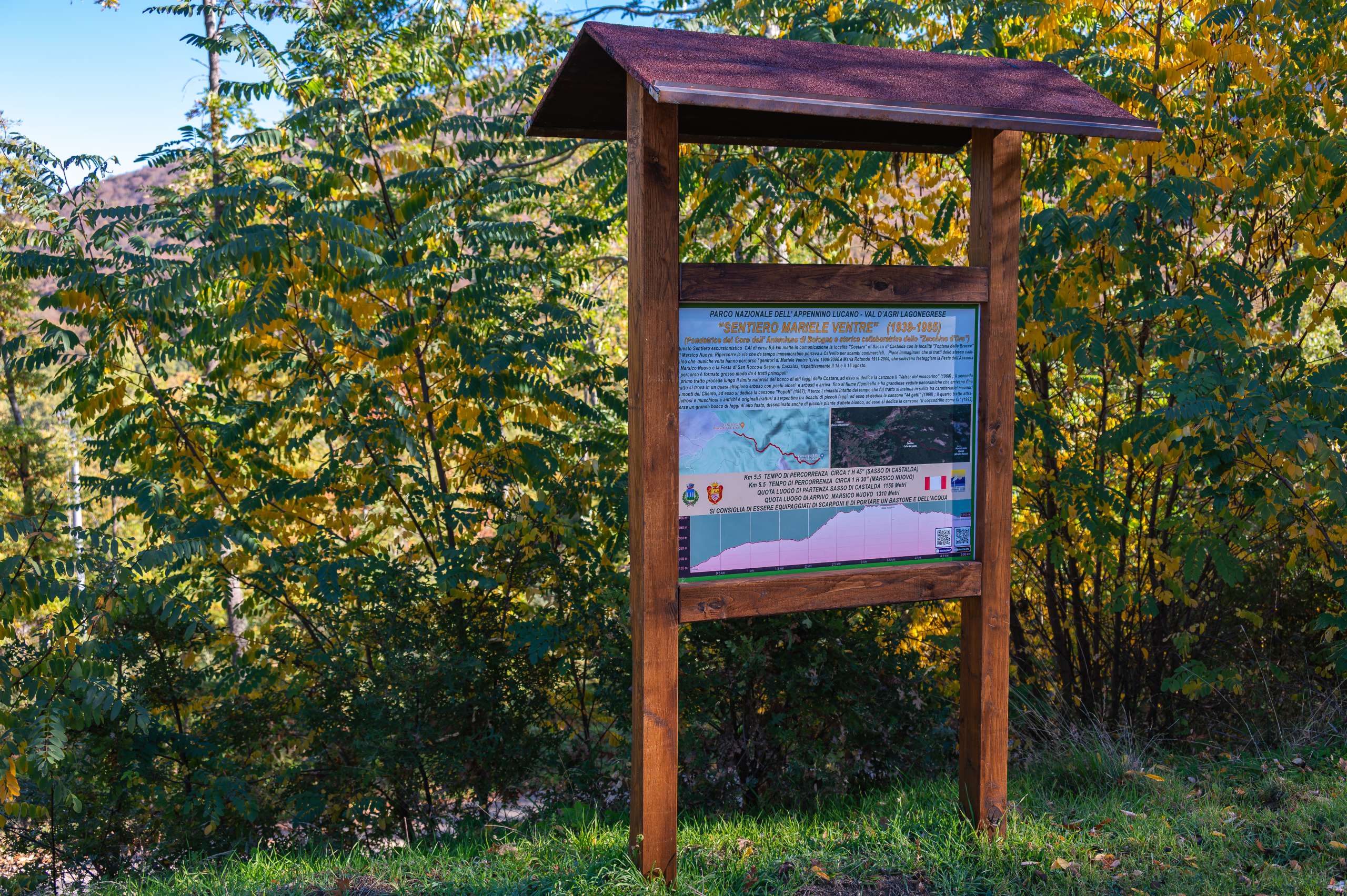 Il sentiero “Mariele Ventre” collega due località “La Costara” di Sasso di Castalda e “Fontana delle Brecce” di Marsico Nuovo. È dedicato a Mariele (Maria Rachele) Ventre i cui genitori erano originari dei due paesi che il sentiero collega: Sasso di Castalda e Marsico Nuovo. Mariele Ventre è ricordata per essere stata la fondatrice del Coro dell’Antoniano di Bologna, più comunemente conosciuto come “Zecchino d’Oro”. Il sentiero ripercorre la via che da tempo immemore collegava a Calvello, paese all’epoca importantissimo per le sue ceramiche, e che probabilmente venne percorso anche dai genitori di Mariele Ventre: mamma Maria Rotundo (1911-2000) di Sasso di Castalda e papà Livio Ventre (1906-2000) originario di Marsico Nuovo per incontrarsi e festeggiare la Madonna dell’Assunta a Marsico Nuovo (15 agosto) e la festa di San Rocco a Sasso di Castalda (16 agosto). Il percorso è formato da 4 tratti principali che prendono il nome dalle famose canzoni dirette da Mariele Ventre e cantate dal Coro dell’Antoniano, divenute negli anni famosissime ed ancora ascoltate dai bambini italiani: il “Valzer del Moscerino”, “Popoff”, “44 gatti” ed “Il coccodrillo come fa”. La prima parte del sentiero dedicata al “Valzer del moscerino” si trova ai margini di un bosco di faggio (Fagus sylvatica L,1753), in particolare la faggeta della Costara, uno dei boschi più vissuto ed amato dai sassesi. La seconda parte del sentiero denominata “Popoff” è caratterizzato da praterie montane che in alcuni punti ospitano stazioni di felci (Pteridium aquilinum (L.) Kuhn) con radi perastri (Pyrus cummunis (L.) subsp. Pyraster (L.) Ehrh.), melastri (Malus sylvestris (L.) Mill.) e biancospini (Crataegus monogyna Jacq.) con sottobosco caratterizzato principalmente da rosa canina (Rosa canina L, 1753). La parte dedicata a “44 gatti” inizia proprio dal guado del torrente Fiumicello, rimasto intatto dal tempo, tra meandri rocciosi e muschiosi, passando attraverso un sentiero a serpentina tra faggi di piccole dimensioni inerpicati alle rocce. L’ultima parte del sentiero che ci porta verso il rifugio Fontana delle Brecce è denominata “Il Coccodrillo come fa” che ospita un bosco fitto di faggio (Fagus sylvatica L,1753) con sporadiche querce (Quercus cerris L., 1753) e diverse sorgenti che rendono il terreno umido.